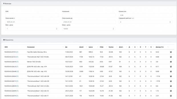 Таблица для подбора облигаций (цены обновляются с небольшой задержкой):
