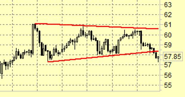 Ну что, нефть пошла туда куда надо. Теперь она может протестировать снизу пробитую фигуру, хотя вряд ли она выше, чем уровень 58 поднимется.